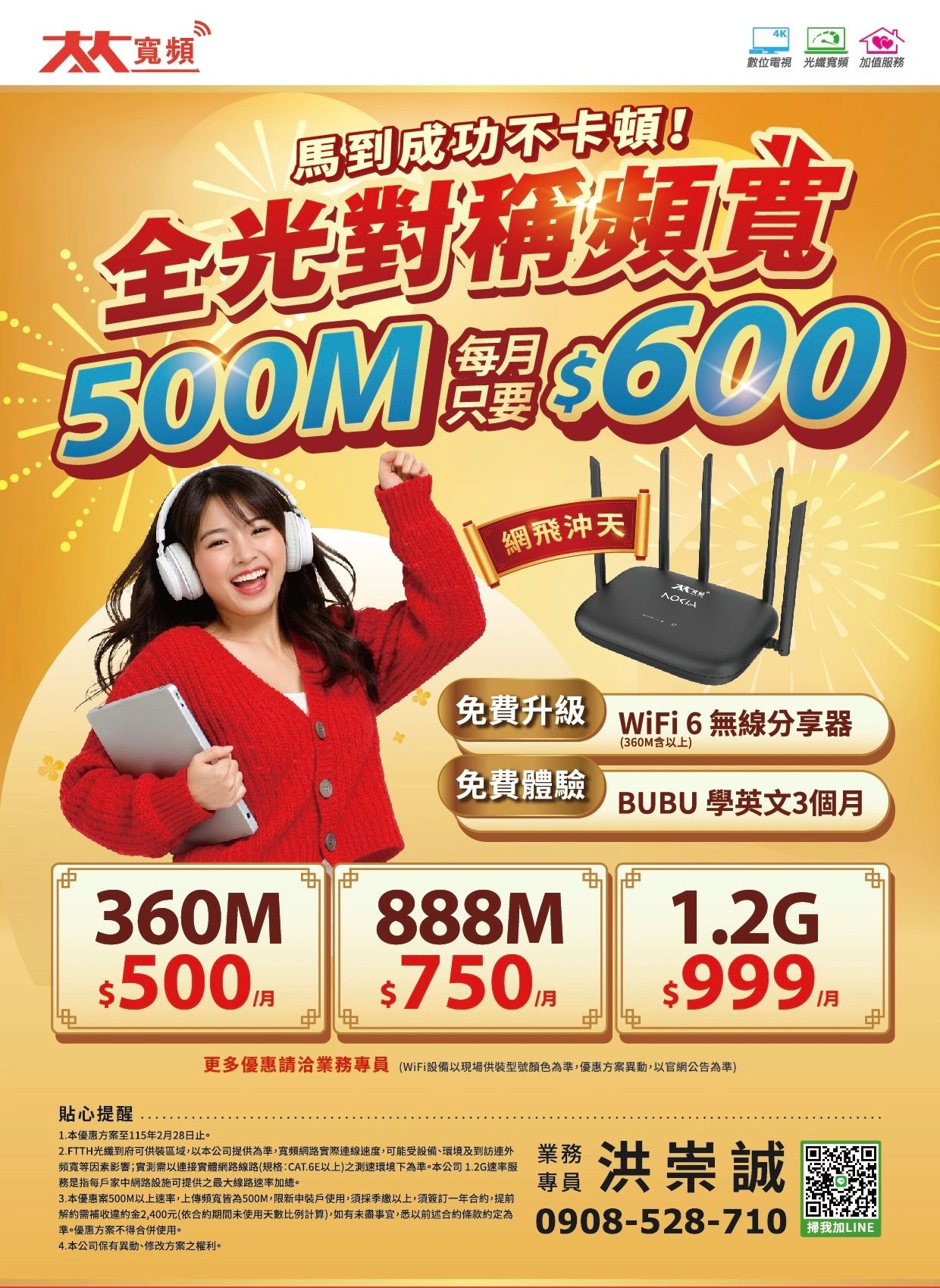 CP值最高的選擇 免費建置WiFi環境重視客戶的需求與服務專屬業務替您服務 大大寬頻|第四台+網路WiFi全程光纖線到您家 0908-528-710新申辦